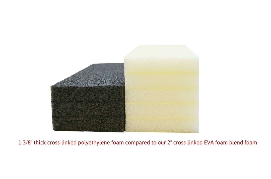 The mat is constructed of 2″ thick firm cross-linked polyethylene EVA foam blend – which has superior flexibility and shock absorbency. The mat is covered in 18 ounce vinyl coated nylon that is fire rated, mildew resistant, rot resistant, UV resistant and is free of lead and phthalates.