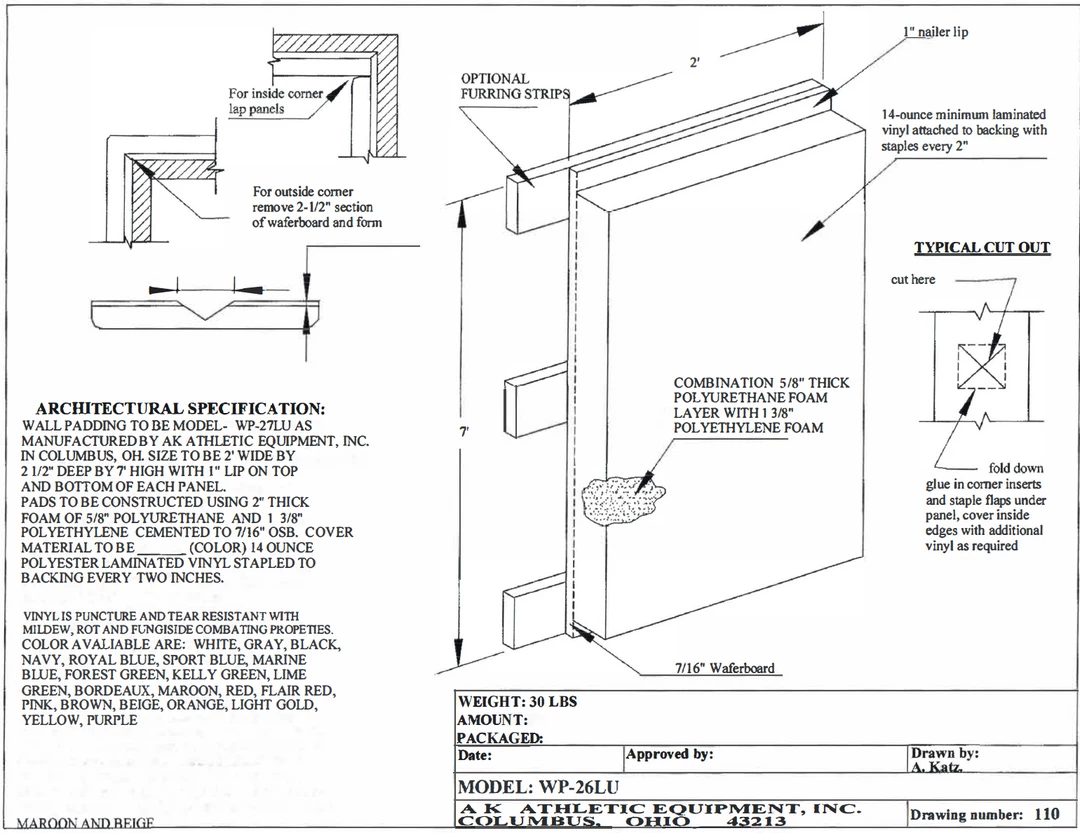 AK Athletics takes pride in tailoring our products to fit perfectly in your space and we provide quotes for custom products at no charge. Our firm 2″ thick foam gym wall pad provides excellent shock absorption for protection even in the most high traffic areas. Cutouts for electrical outlets and custom designed pads are crafted in our factory. 1″ nailer lips at the top and bottom of the pad allow for easy installation, or we have a diy outlet insert to make cut outs on site.Â